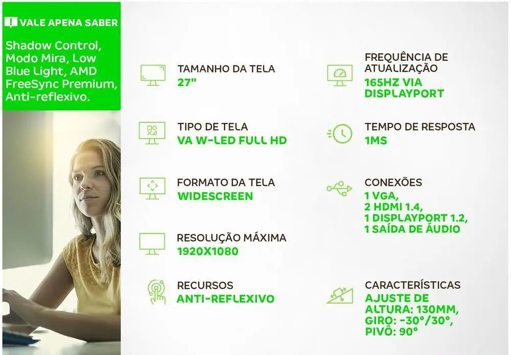 Desfrute de cores vibrantes e amplos ângulos de visão com o painel VA, e ajuste a altura, o giro e o pivô para uma ergonomia personalizada. A tecnologia AMD FreeSync Premium elimina distorções, enquanto o Modo Mira e o Shadow Control aumentam sua precisão em jogos de tiro. E com a função Low Blue Light, seus olhos ficam protegidos durante longas horas de jogatina.