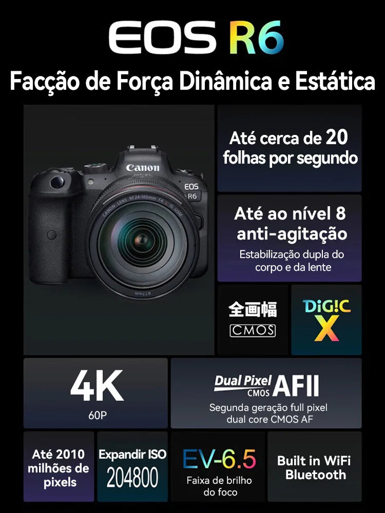 Seja para capturar fotos deslumbrantes ou criar vídeos cinematográficos, a Canon EOS R6 Mark II é a câmera sem espelho definitiva para criadores de conteúdo exigentes. Combinando um desempenho fotográfico impressionante com recursos avançados de vídeo, ela é projetada para atender às necessidades tanto de fotógrafos quanto de videomakers.
