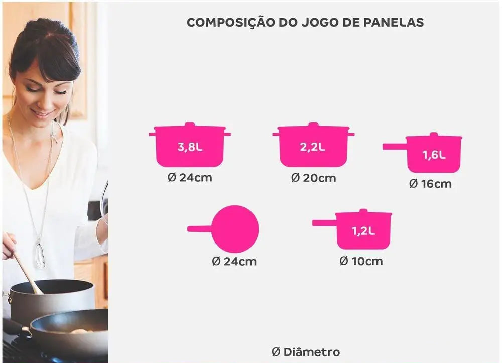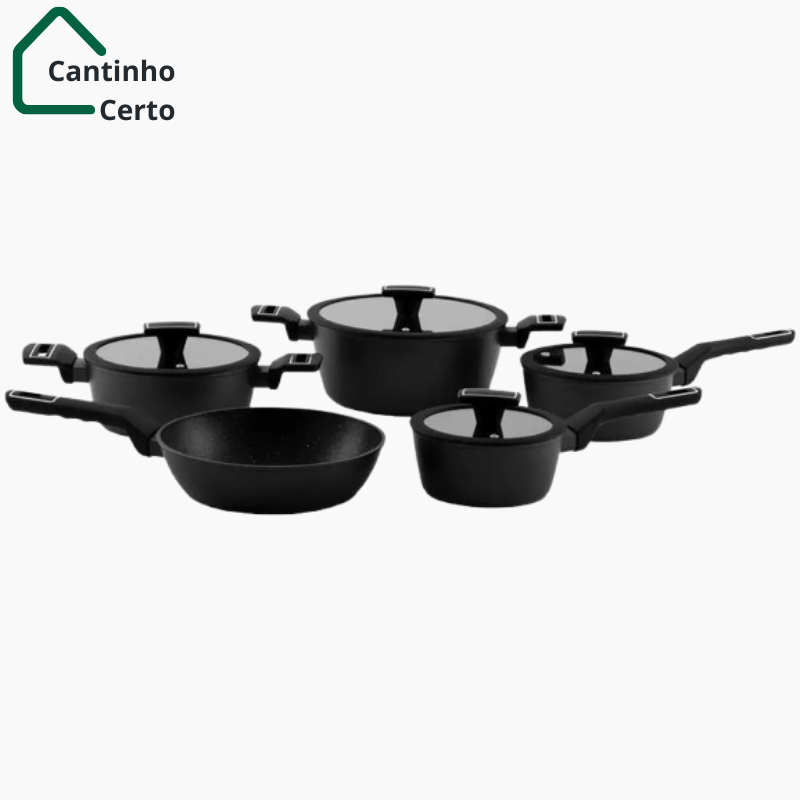 - Conjunto Completo: Inclui 5 peças essenciais – panelas de 16cm, 18cm, 24cm e caçarolas de 20cm e 24cm, todas com tampa de vidro.