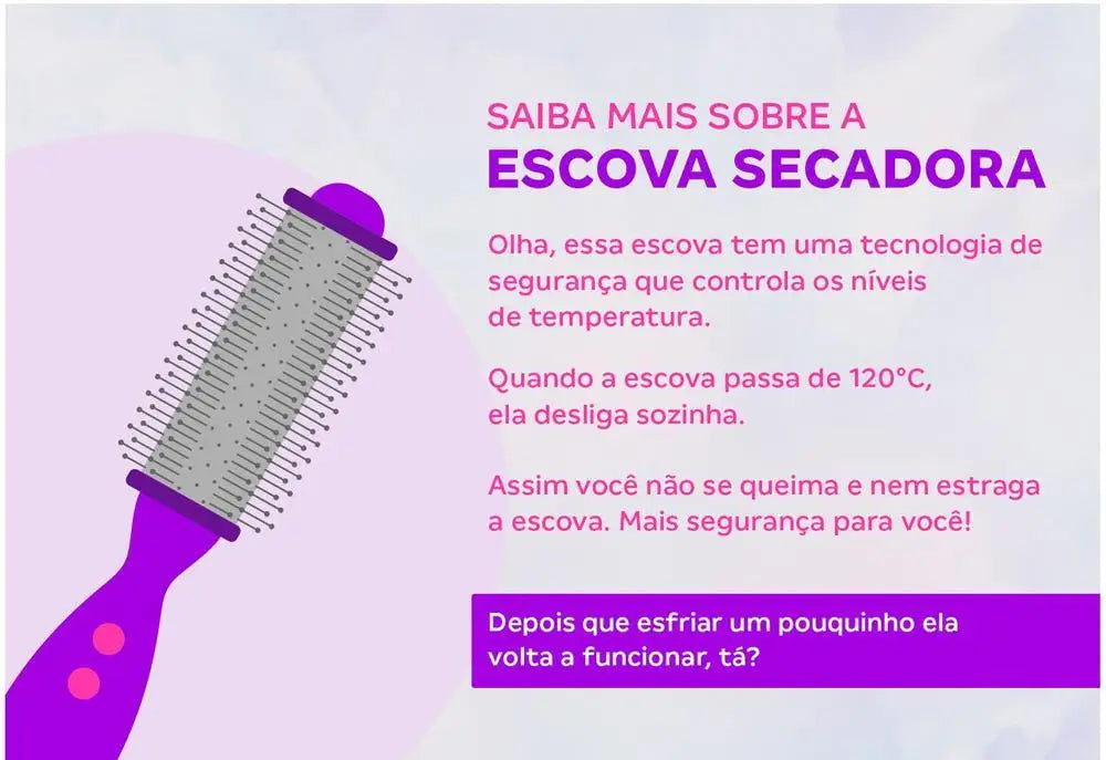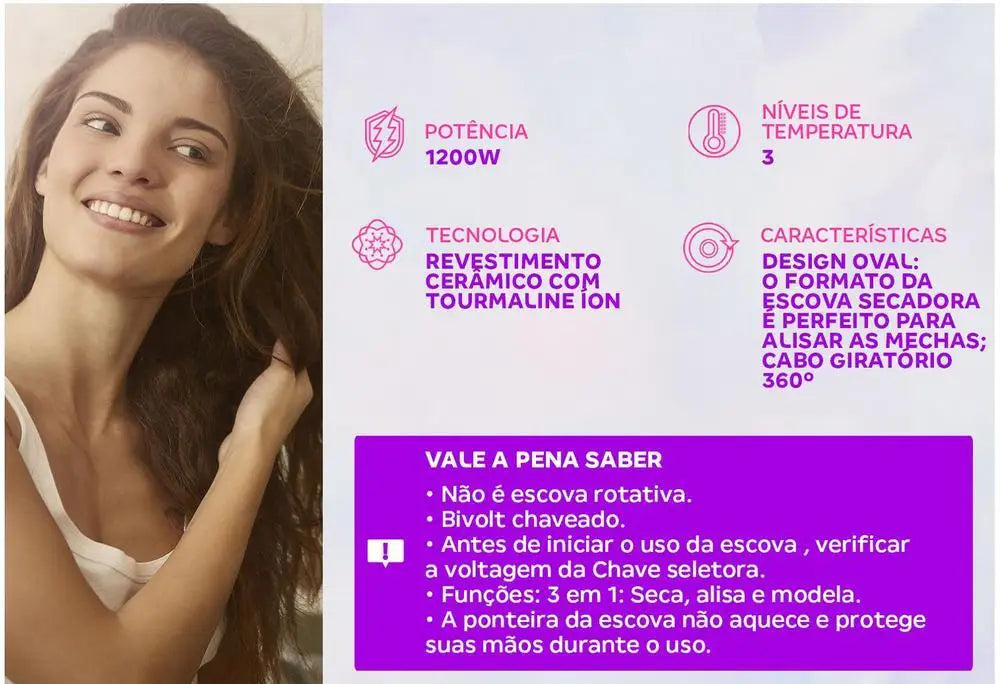 🔸 Potência e versatilidade: Com 1200W de potência e 3 níveis de temperatura, ela atende a todos os tipos de cabelo, garantindo um acabamento impecável. O design oval é perfeito para alisar e dar volume aos fios, enquanto as cerdas duplas proporcionam mais resistência e firmeza.