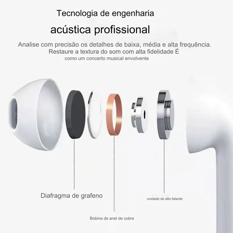 - Carregamento rápido: apenas 1,5 horas para os fones e 2 horas para a caixa de carregamento