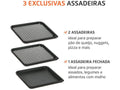 - Acessórios inclusos: 2 formas de assar, 1 luva de silicone, 1 livro de receitas e 1 coletor de gordura.