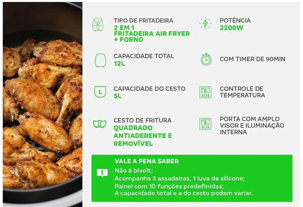 - Capacidade total de 12L: Espaço de sobra para preparar suas receitas favoritas para toda a família.