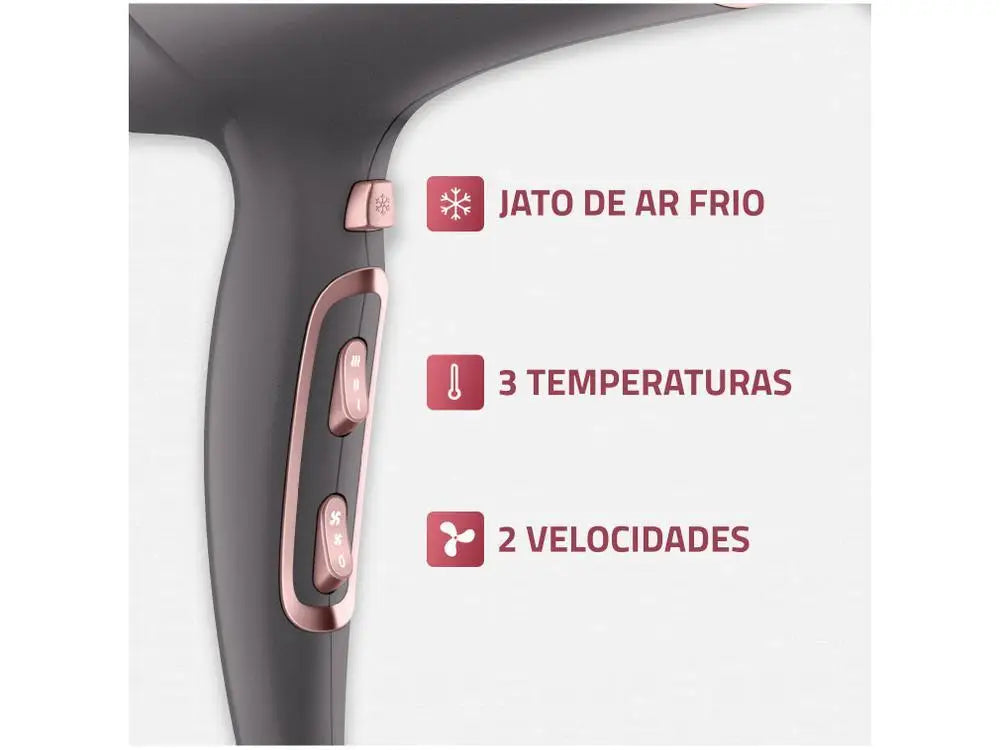 🎨 Design Elegante e Funcional: Disponível nas cores Graphite e Rosé, é um secador que combina beleza e praticidade, com uma grade cerâmica que distribui o calor de maneira uniforme, minimizando danos.