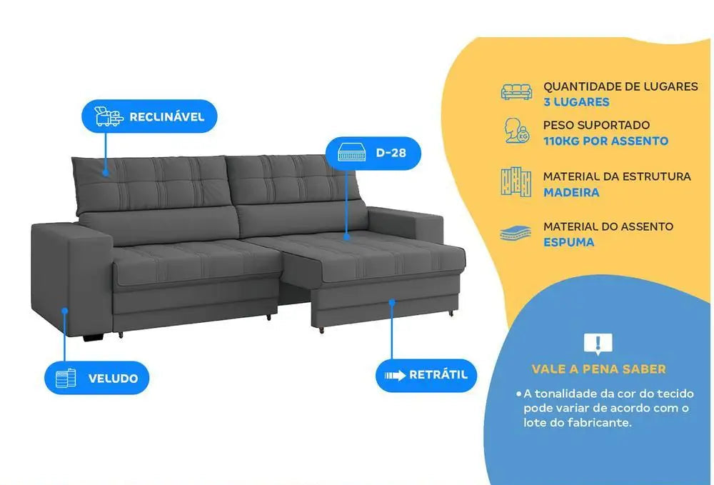 Com design exclusivo e acabamento em veludo de alta qualidade, o Sofá Medellín conta com assentos retráteis e encostos reclináveis em 3 posições, proporcionando o máximo de relaxamento, seja para assistir filmes ou simplesmente descansar.
