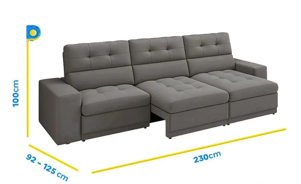 - Dimensões: 230cm (L) x 100cm (A) x 92cm (P) / Estendido: 125cm