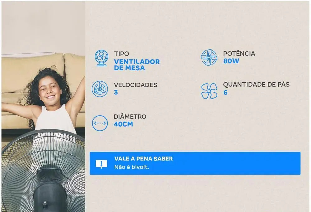 🔹 Economia de Energia: Com potência de 80W e baixo consumo, o Mondial VSP-40-B2 é eficiente e econômico, proporcionando conforto sem pesar na conta de luz.